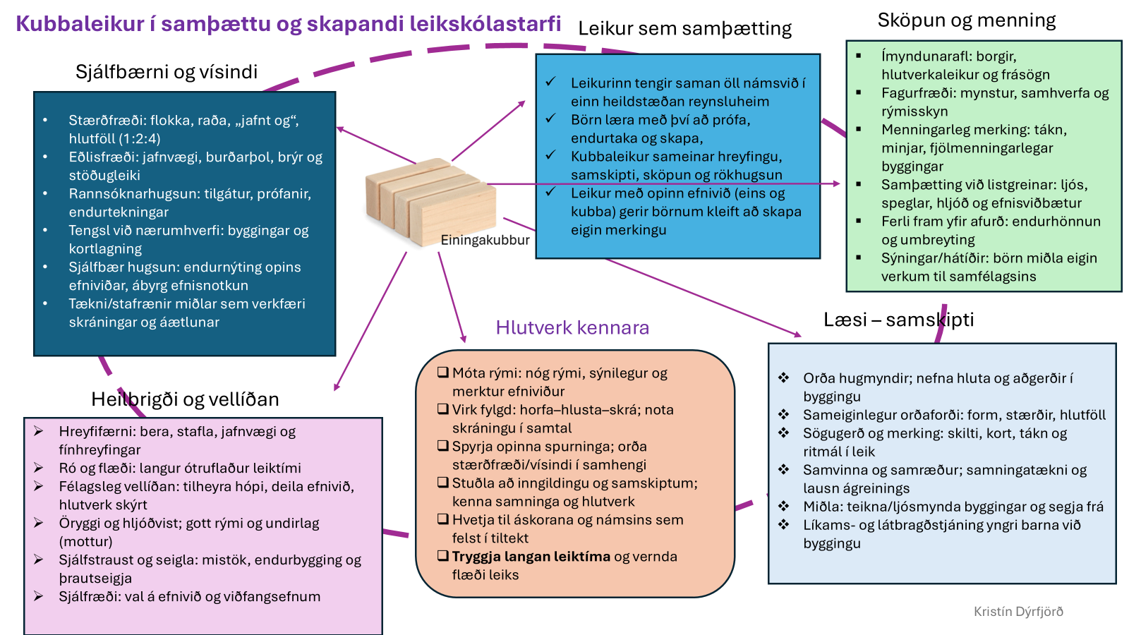 Góð leið til að sameina öll þessi ákvæði Aðalnámskrár leikskóla er leikur með einingakubba. Með stórum og litlum kubbasettum. Með litlum börnum er t.d. hægt að nota smærra settið (sem er í sömu hlutföllum og stóra settið en kubbarnir eru minni). Sem hluta af námskeiði þar sem ég fjalla um einingakubba, setti ég saman mynd þar sem ég skoða hvernig hægt er að tengja einingakubba við öll námsvið leikskólans í gegn um leik. Myndin er afar lýsandi og sýnir fram á hversu gríðarlega mörg og fjölbreytt námstækifæri gefast með kubbaleik.